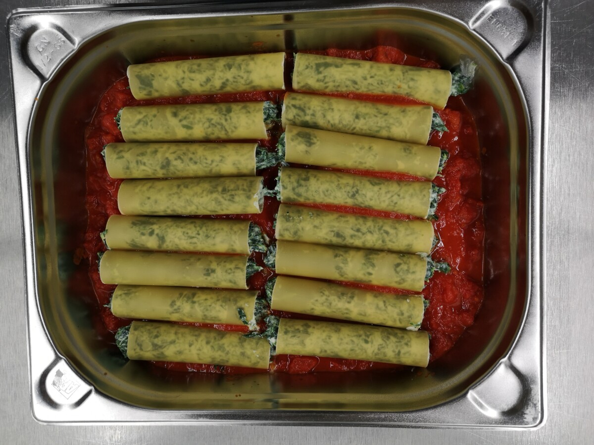 Heute wird in der Küche Canelloni mit Spinatfüllung vorbereitet. Herr Simon Ursprung, Berufsbildner leitet Sarah an. Kurzerhand übernimmt sie die Aufgabe und meistert diese mit Erfolg.