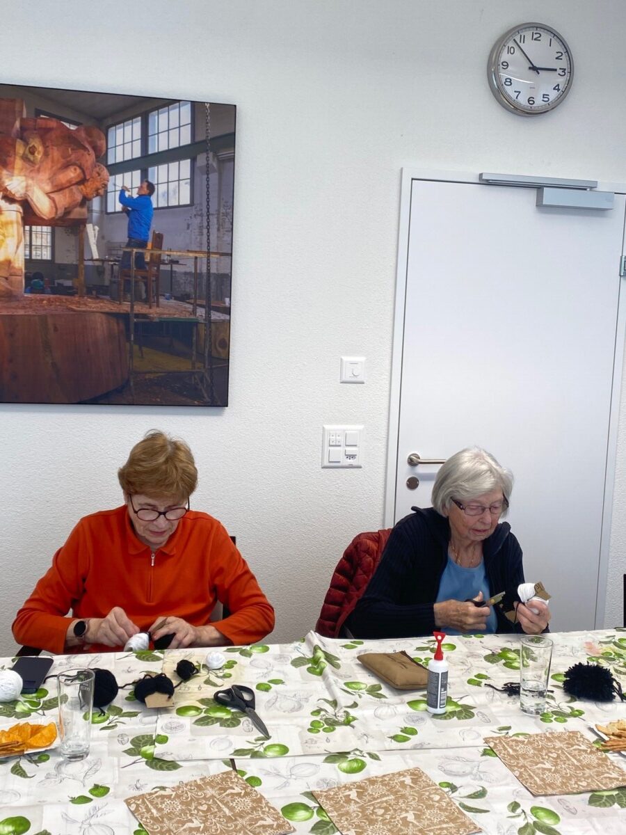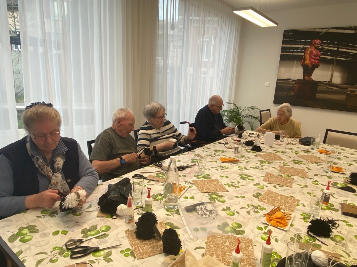 Wir haben mit schwarzer und weisser Wolle Pompons gebastelt.