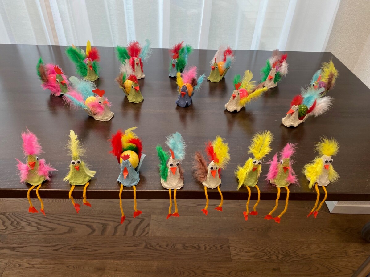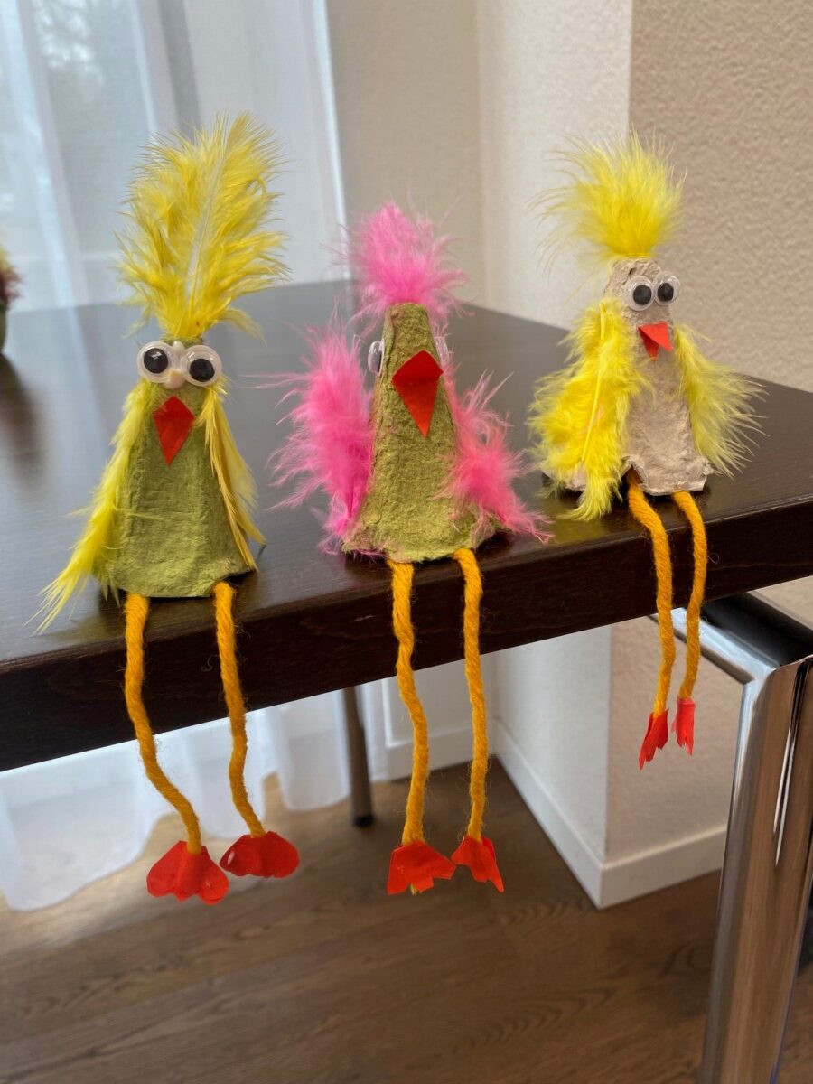 Nachdem wir alles am gewünschten Ort befestigt haben, haben die Hennen noch ein Ei im Körbchen erhalten und schon sind unsere süssen Küken fertig.
