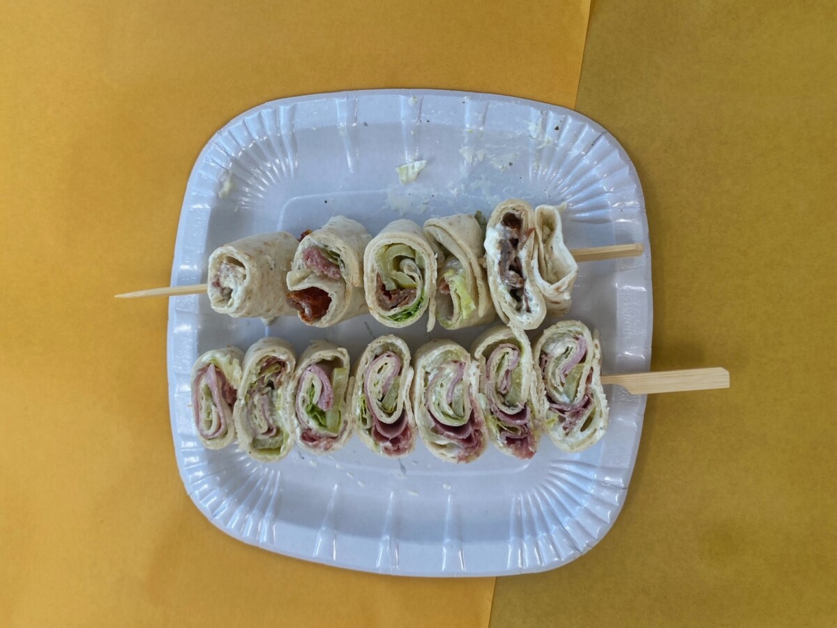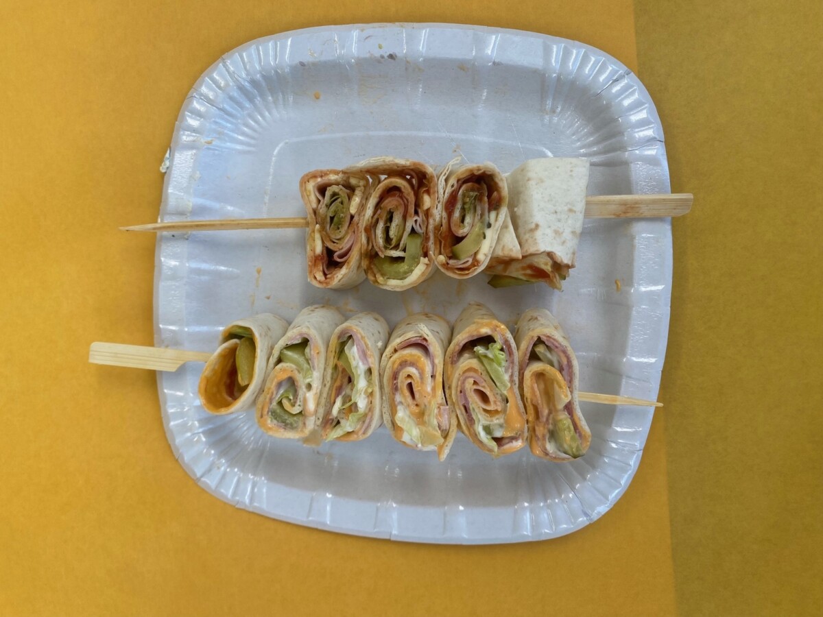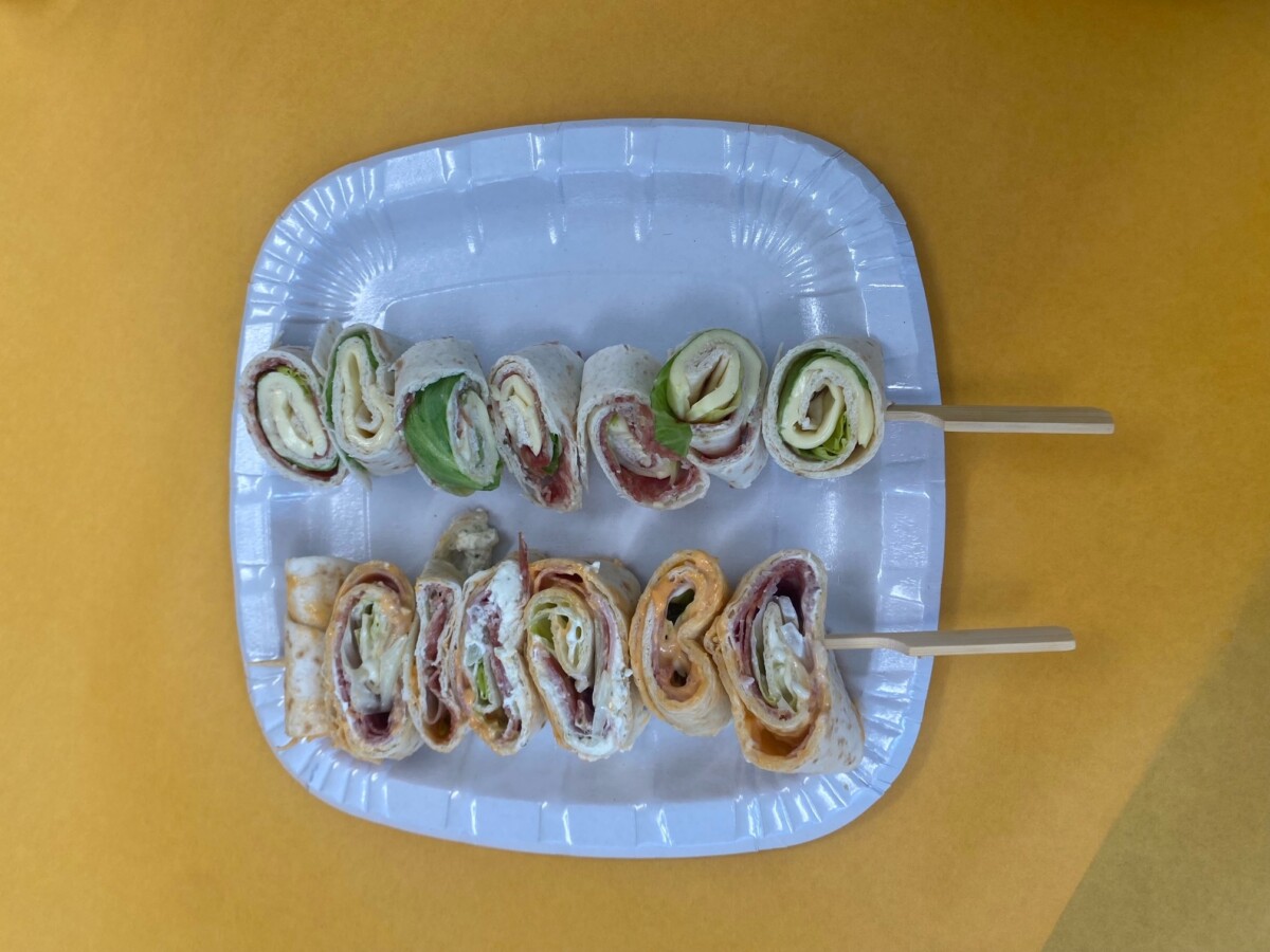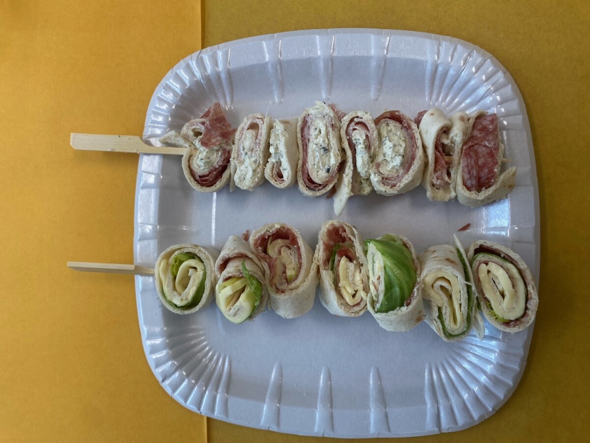 Anschliessend wird es mit Toastkäse, Salami oder Schinken, Gurken und Salatblättern belegt. Schlussendlich wird die Brotscheibe satt aufgerollt und in Rollen von 3cm geschnitten.